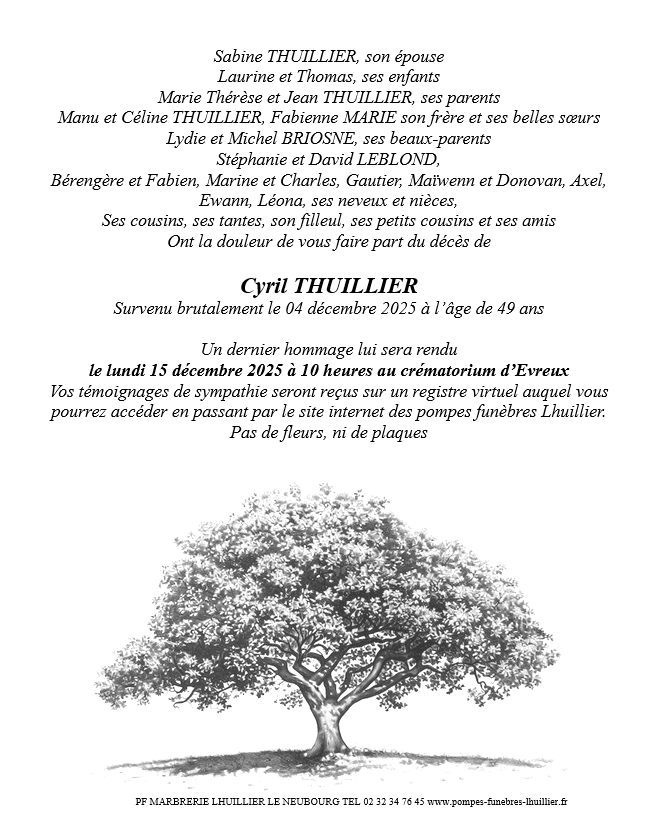C’est avec une grande tristesse que nous vous annonçons le décès de Cyril THUILLIER survenu le jeudi 04 décembre 2025 à Heudebouville.
