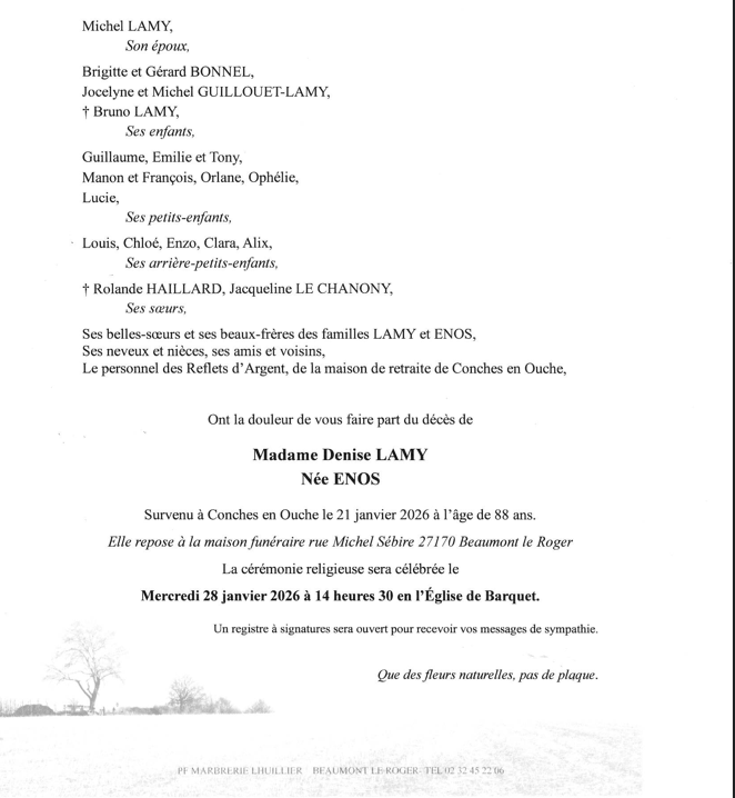 C’est avec une grande tristesse que nous vous annonçons le décès de Denise LAMY survenu le mercredi 21 janvier 2026 à Conches en Ouche. La cérémonie se déroulera le mercredi 28 janvier 2026 à 14h30 à l’adresse suivante : Église Saint Pierre et Saint Paul - 27170 Barquet.