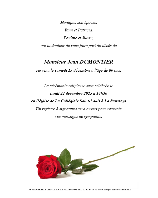 C’est avec une grande tristesse que nous vous annonçons le décès de Jean DUMONTIER survenu le samedi 13 décembre 2025 à Louviers. La cérémonie se déroulera le lundi 22 décembre 2025 à 14h30 à l’adresse suivante : Eglise Collegiale Saint-Louis - 3 Place du Cloître - 27370 La Saussaye.