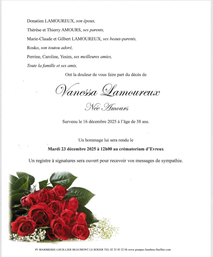 Vanessa LAMOUREUX 1987 - 2025 Marie Agnès Aujourd’hui, c’est un jour difficile car je dois te dire au revoir alors que je t’aimais tant. Les années passent, je me disais que j'avais une marraine exceptionnelle, gentille, toujours attentionnée. Quelle tristesse pour moi, tu me manqueras énormément, je ne t'oublierai jamais. Au revoir Marraine. Lucas Morel Devant ce douloureux coup du sort, je suis à la fois triste et décontenancée. Je voudrais vous apporter un peu de réconfort, mais, aujourd’hui les mots me manquent. Anaïs Henri Toutes mes pensées affectueuses à vous, qui m’avez fait aimer les mathématiques. Votre gentillesse, votre pédagogie envers nous restera gravé comme un précieux souvenir de mon enfance. Vous avez marqué ma vie bien au-delà de la salle de classe. Reposez en paix.