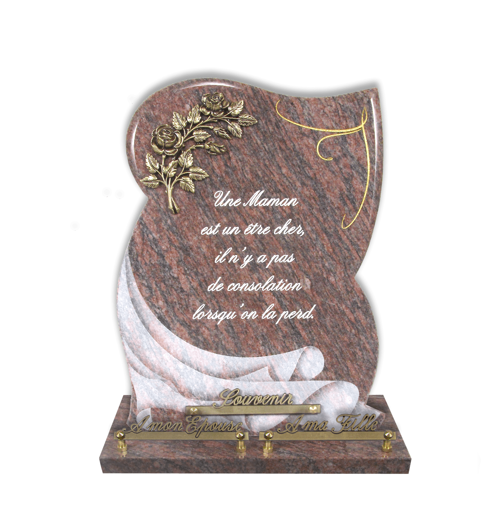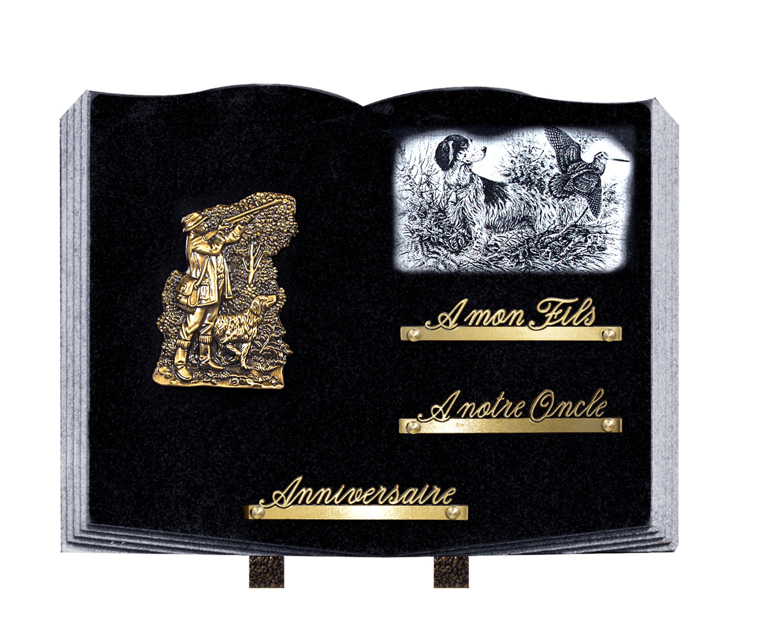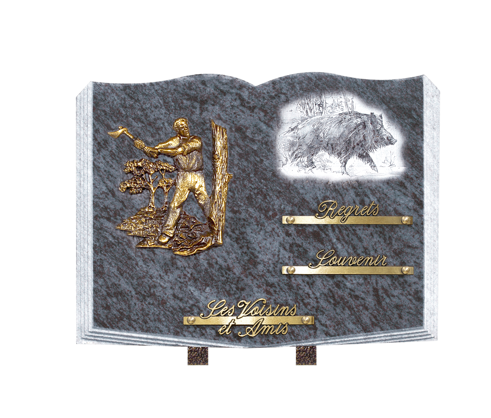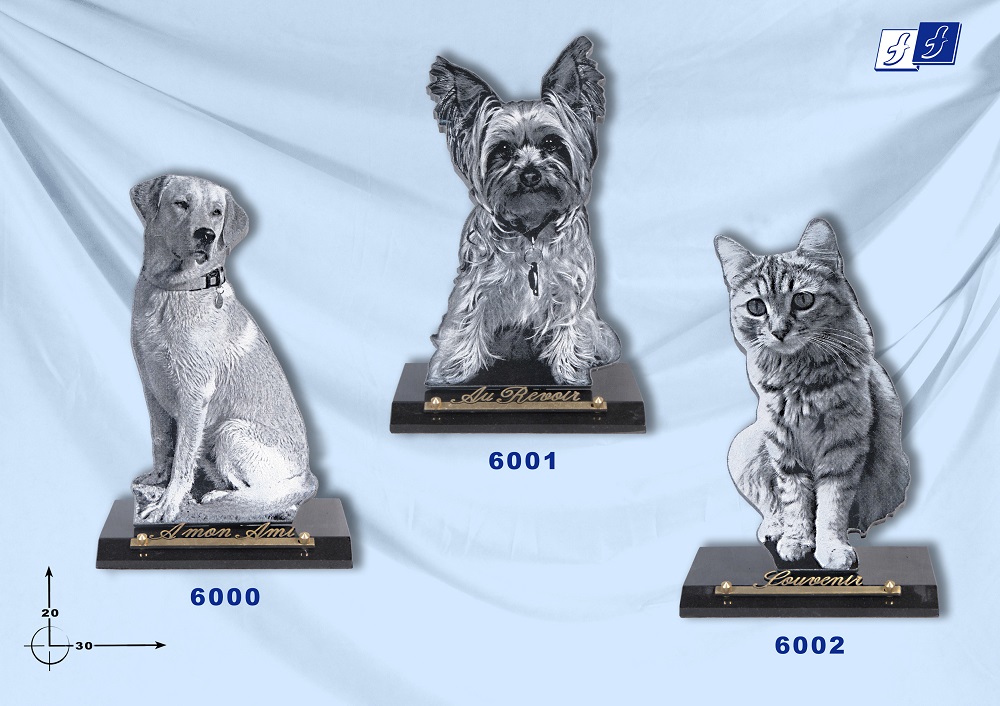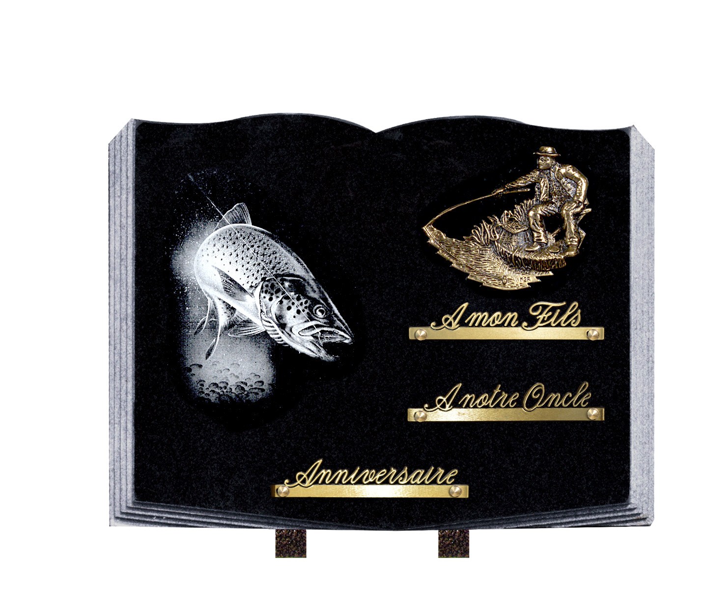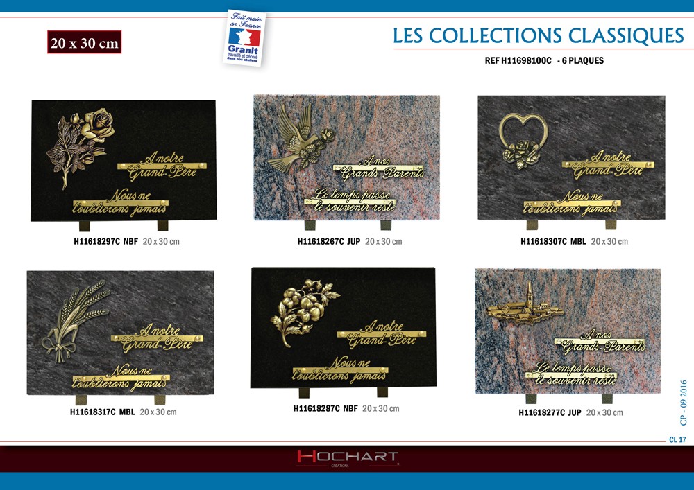 Nous disposons d’un large choix de plaques funéraires, des plus classiques au plus originales. Nous essayons d’avoir un large choix de thèmes comme la chasse, la pêche, le cyclisme, la musique, l’amour, etc.. Mais malgré tous nos efforts si aucune plaque ne vous convient nous pouvons en faire une sur mesure avec toutes les personnalisations de votre choix.